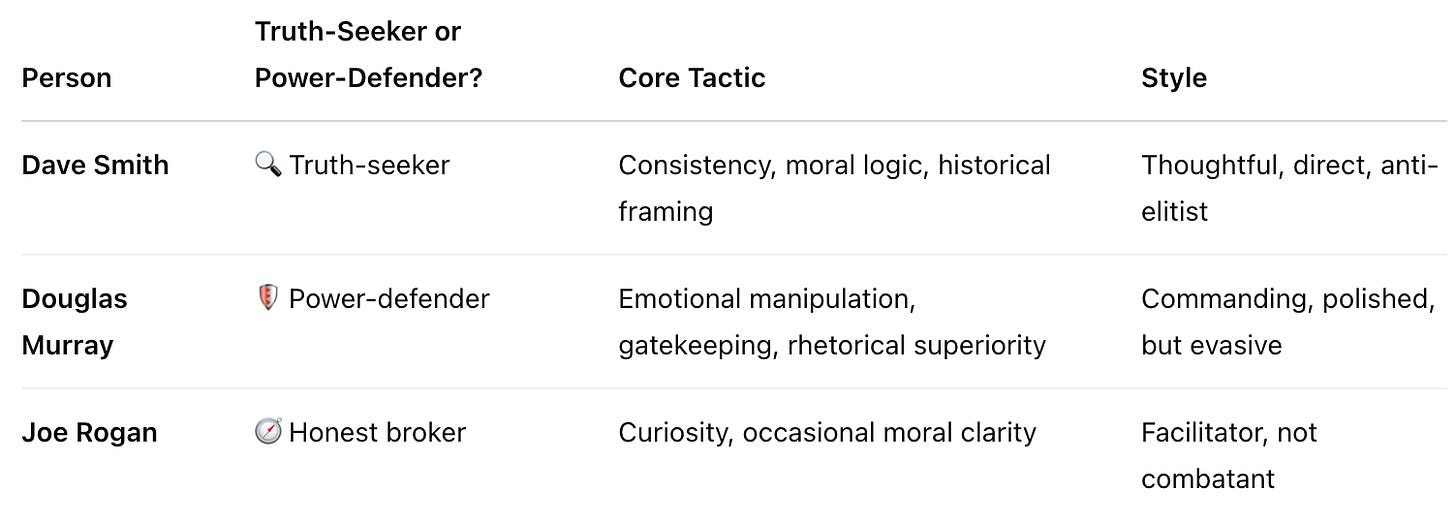 This exchange is basically a microcosm of the wider divide this Rogan/Murray/Smith convo stirred up. It’s establishment epistemology vs. outsider skepticism — “credentialed truth” vs. “lived pattern recognition.”