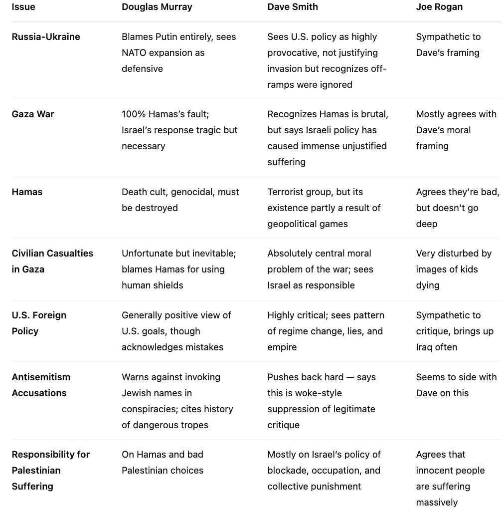 Thanks for sharing the full transcript — that was a dense, passionate, and at times combative three-way conversation between Joe Rogan, Dave Smith, and Douglas Murray. Here’s a general assessment of the arguments and where each of the three men stands: