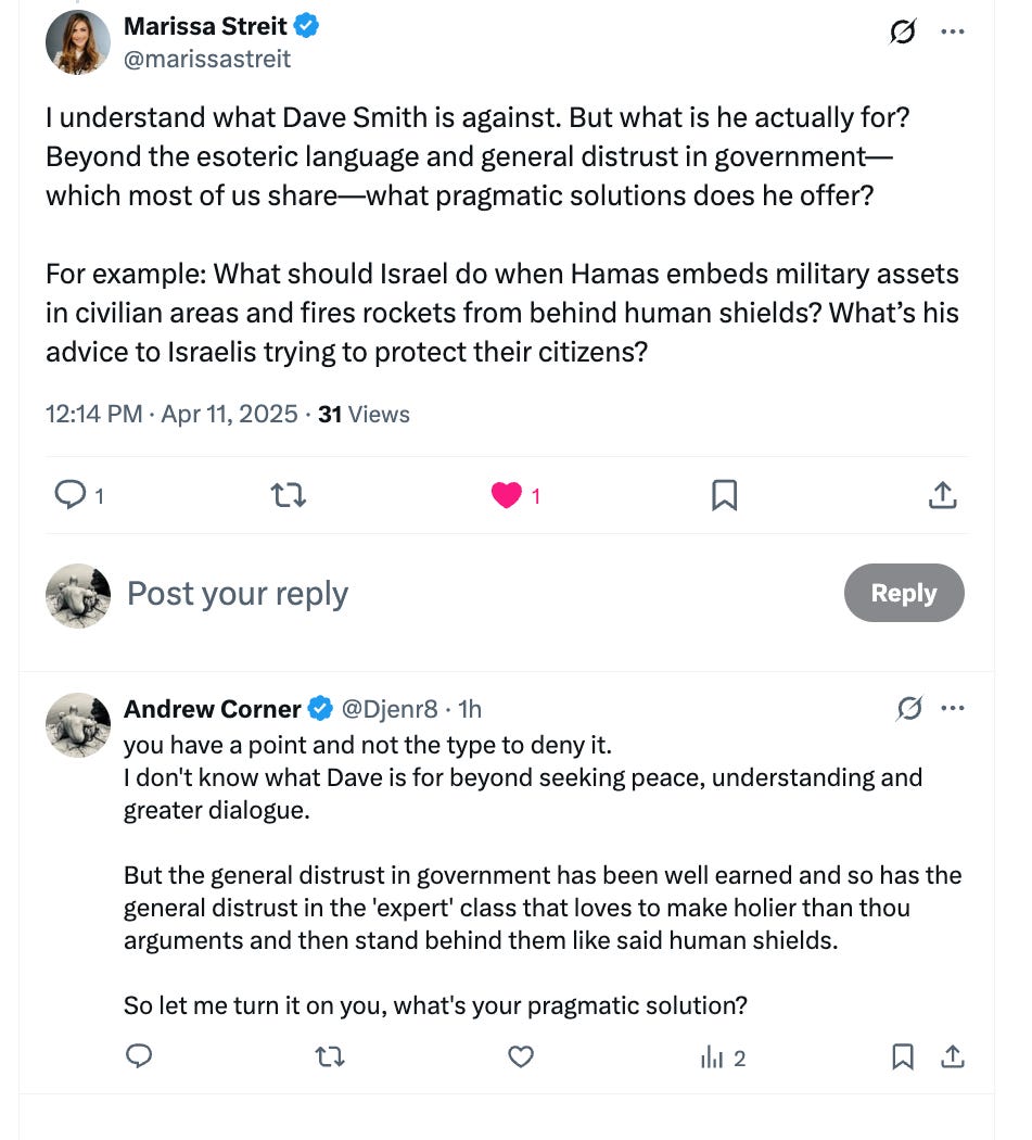 "I don’t know what Dave is for beyond seeking peace, understanding and greater dialogue."