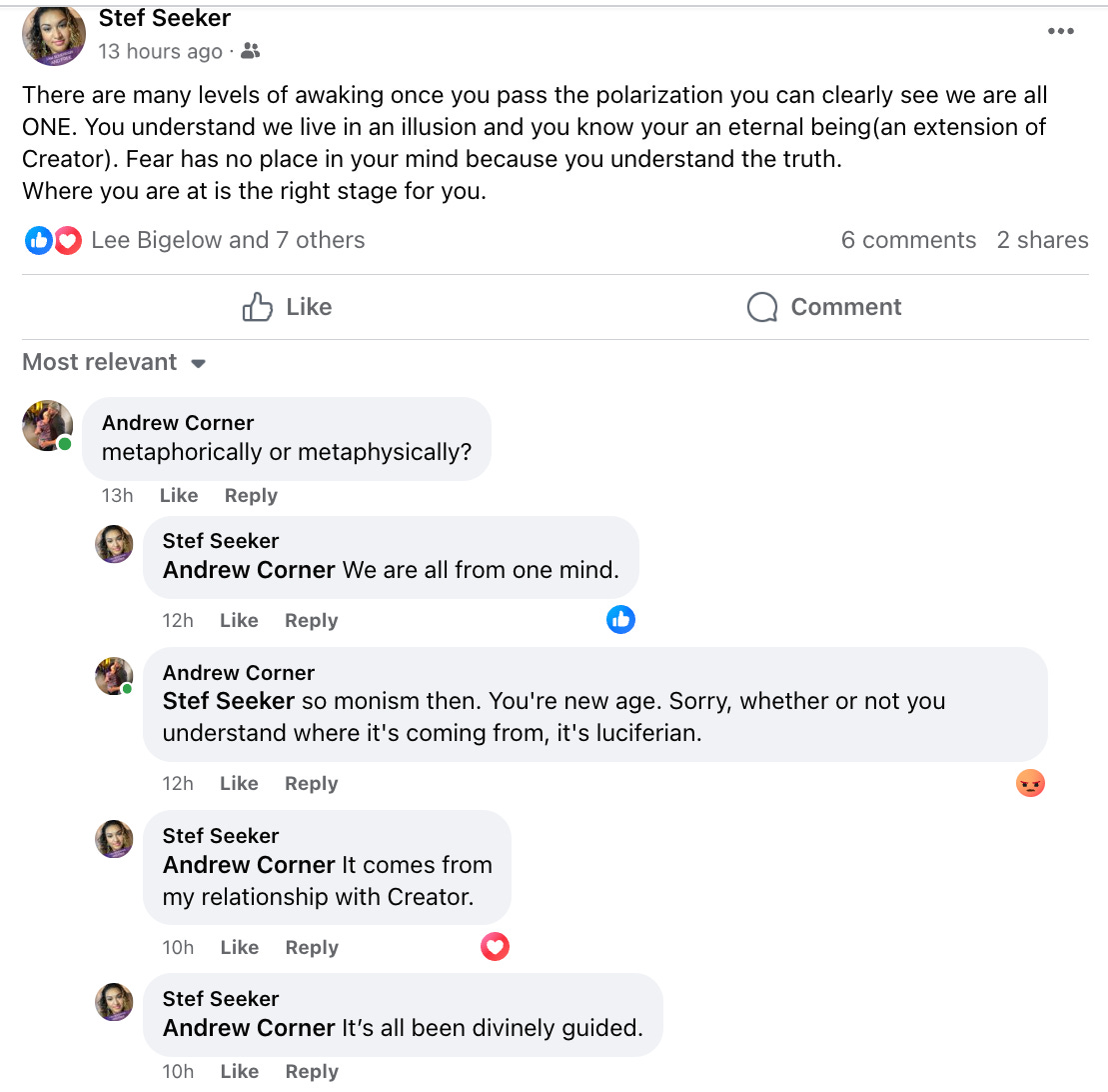 Below I’m going to provide another encounter I had with someone on my facebook this morning who I think means well, but has fallen for the ‘trap’ that has been set for us by various ‘new age’ ‘mystics’, who are playing with powers they don’t even seem to be able to comprehend. It plays itself out in many ways, but this is one of the key ones. First, I’ll post the comments I was responding to in a screen shot, then I’ll give my comments to the false gods these people keep pushing, without even realizing what it is they seem to be advocating for. This is the metaphysical attack this is happening to Humanity, at the same time as the very real, very pervasive, physical attack that is the 4IR, and the IoB and the IoT. Please understand, I am NOT attacking Stef, I’m trying to help her see what I see. If people buy this narrative about what Humanity is, they will passively accept what is coming along with it, and that is the real trap :
