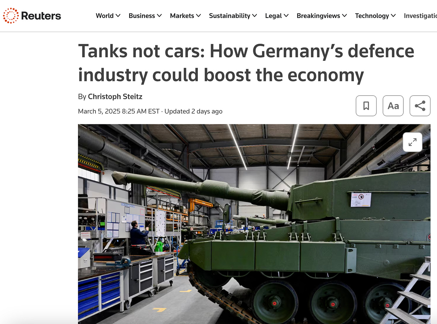 Being ever the pragmatists, the Germans are shifting production of cars that arenât selling to tanks that theyâre planning on sending our children to war in.