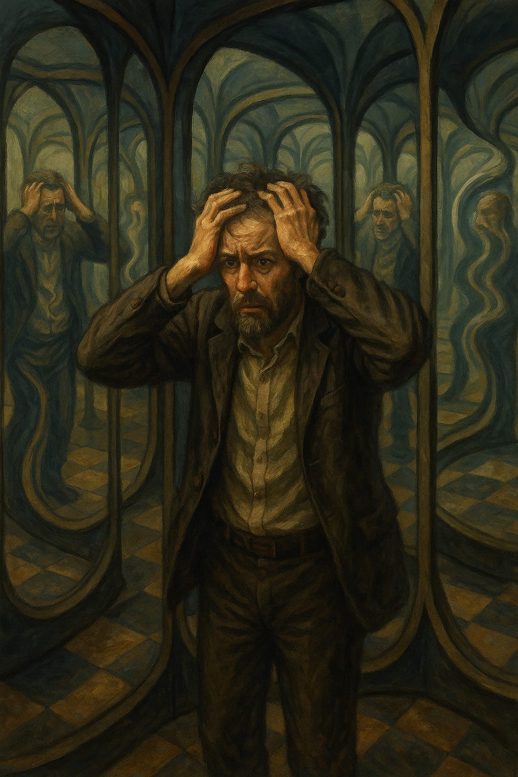 We now enter the most disorienting room in the house — the hall of distorted mirrors. Here, shapes twist, scale warps, and the self stares back in panic. The air is thick with suspicion. The light flickers. The reflection seems to whisper, “Something is terribly wrong.”