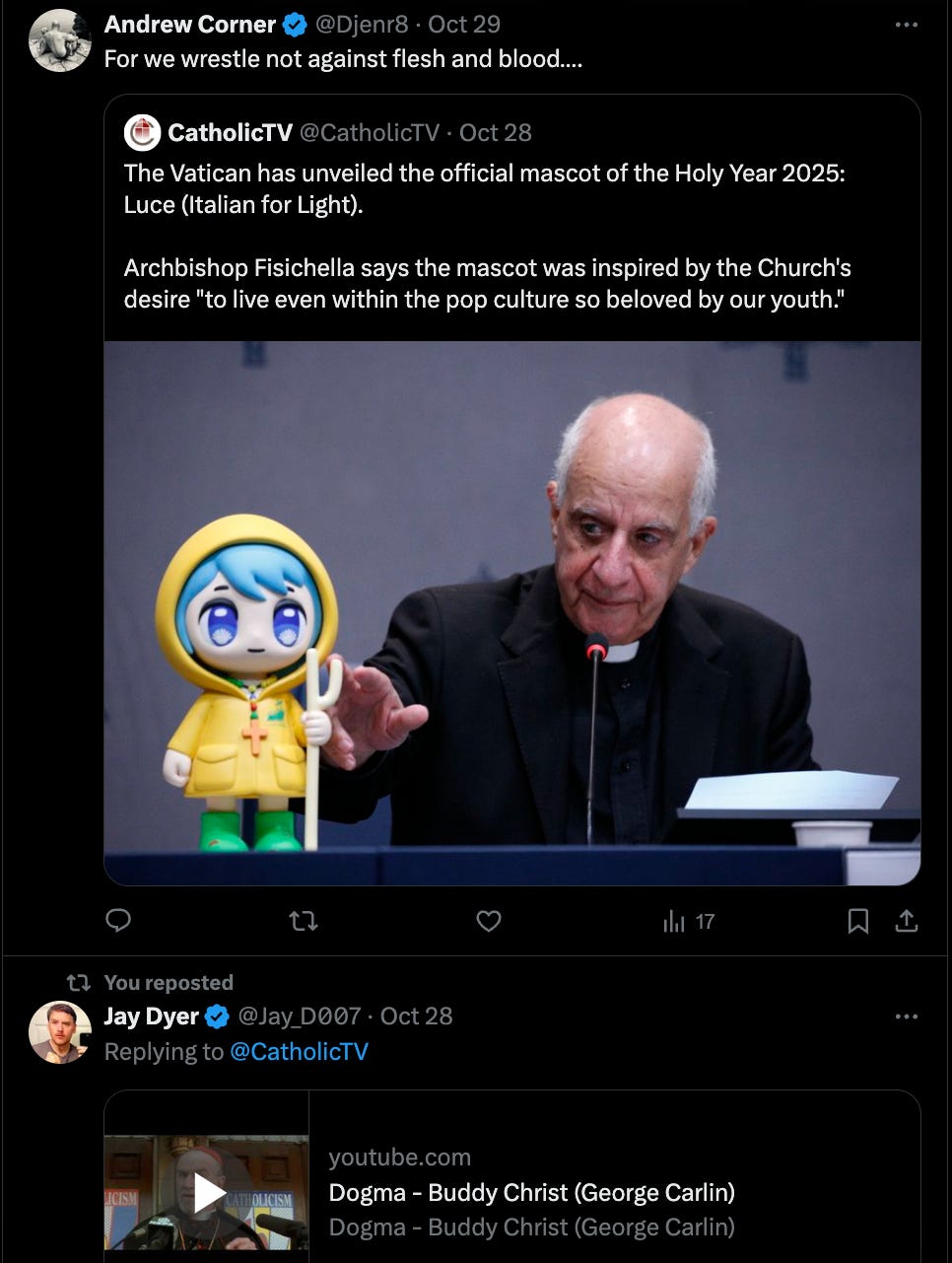 Wrapping up the dream, I remember something like the day being over, and the employees were kind of filing out, so I followed suit. I bumped into what I assumed was the CEO, who was also walking down the hall. She acknowledged me, and welcomed me. But like most CEO’s, she was on her way somewhere and was being followed by a handful of assistants, and juggling different tasks while she walked. What’s hilarious is I’m pretty sure it was Selma Hayek, who’s I’ve always thought was an extraordinarily beautiful woman, and, she was in a movie I watched yesterday, somewhat randomly, as one of the crazy things that just happened in the real world, is the Catholic church unveiled this new doll like thing that just seemed so nuts it’s hard to believe it’s real, but Jay Dyer chimed in with the absolute perfect response, so I went back to the movie it’s from.