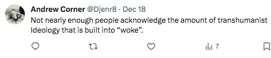 Instead, we were fed many riddles that went on and on, circling the Concept, playing it out, expressing the World view of the writers, themselves tranhumanists to the Core. In fact it’s one way to acknowledge what should be an Obvious Point by now to anyone who is paying attention, that transgerderism is the gateway to transhumanism. It is using our Modern technologies to alter our bodies in ways we Think will help us deal with what can only be properly understood, as a kind of self disgust. Why else would a Human Being be so cavalier about accepting the Premise that Human Beings are actually Not Worth Preserving, that they would plow headlong into a paradigm that suggests we’re going to be replaced with something ‘they’ Clearly have decided is ‘better’, or Preferable to Us?