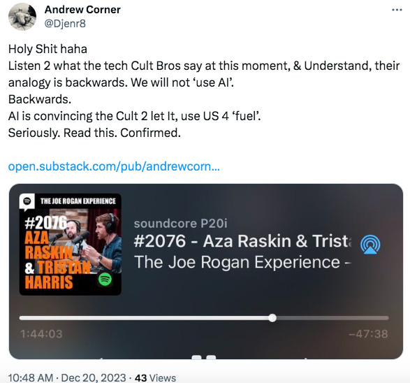From the conversation, after a few minutes of talking about how AI is so amazing it’s going to help us talk to the Animals, and Joe lightening the mood in the way that he does best, with crude humour, around 10 minutes, Tris-ton goes into the same diatribe he’s been giving since the Social dilemma, which shockingly maps perfectly onto the back of the AI dilemma, Almost as if they were actually about the Same thing in the First Place, but again, that’s just me Wildly speculating again, Obviously.