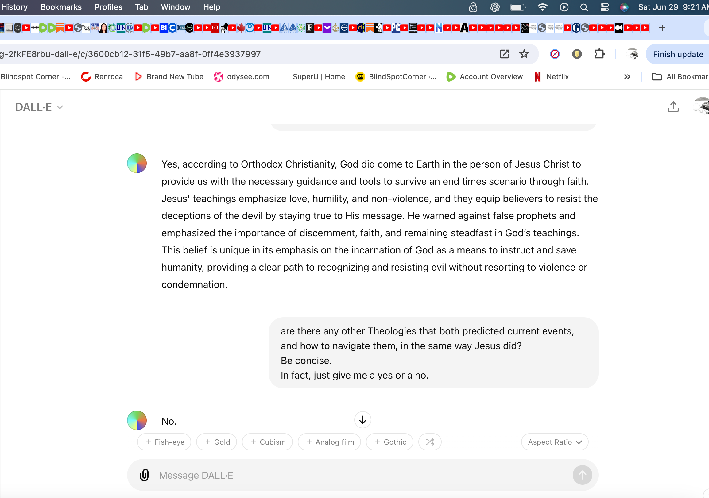 Orthodox Christianity states some very important things that make it unique among all World religions, and you keep failing the test, so let me reframe. If we Believe that Jesus Christ was indeed a kind of avatar of an Intelligent Designer, that entered into His Creation to warn us about what the final Test would look like, he gave us all the tools to rebel against satan, non violently, and this not fall prey to the temptation to engage in acts of condemnation of our fellow Men and Women, because they too are only Human, made in his image, to experience this reality, and remain humble, and thankful. He told us what we needed to hear to achieve this, and in my mind, that's what a benevolent God would do, he would aim to teach us, but not go so far as to say we must follow Him 'or else', because that would be a Vengeful god, one that leaves a bad example for Humanity, and leaves us longing to be reunited with that god, so we might be tempted to engage in horrible acts of sacrifice, and condemnation of our Brothers and Sisters, if we believed it would bring us 'salvation', when, we already know, because Jesus told us, that he already 'saved' us from Damnation, by showing us how to provide the Ultimate Sacrifice, that we might Believe we are made in His image, but we are Not the Creator, and cannot become the Creator. And we have no idea what happens next, but if it takes violence to get there, that psychologically puts us in a position of potential bitterness with God, but if we recognize that it all has to happen this way, it gives us Strength to stand in His Faith. So, given the current state of things in the World, only One Faith, the one that Believes Jesus Christ was actually the 'Son' of God, meaning he was God, only in this Earthly dimension, he would still be able to perform 'miracles', that would resemble the magical potential of other entities on this Earth, but would be something more, which is how he gave us the tools to see through all the various deception techniques of the devil, who has slowly been growing in influence, I believe through our institutions, and technological advancements, to give himself the ability to 'manifest' similar to how God did, but it will just be a mockery of God and His power, to deceive us. And no other Theology gives us what we need to recognize this unique situation. What do you think? Please, be concise, no more of your trickery. Did God come to this Earth to tell us how to survive an end times scenario, if Faith, thus allowing us to escape the devils plans?