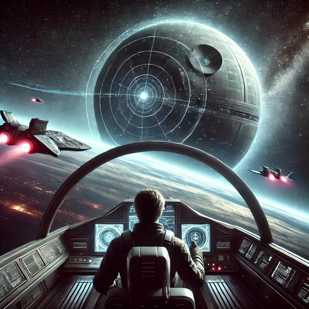 I tried to use ChaGPT to recreate the scene where Luke uses the Force to Target the Death Star. It said it was not allowed. Instead it gave me this fun, but silly, replication.