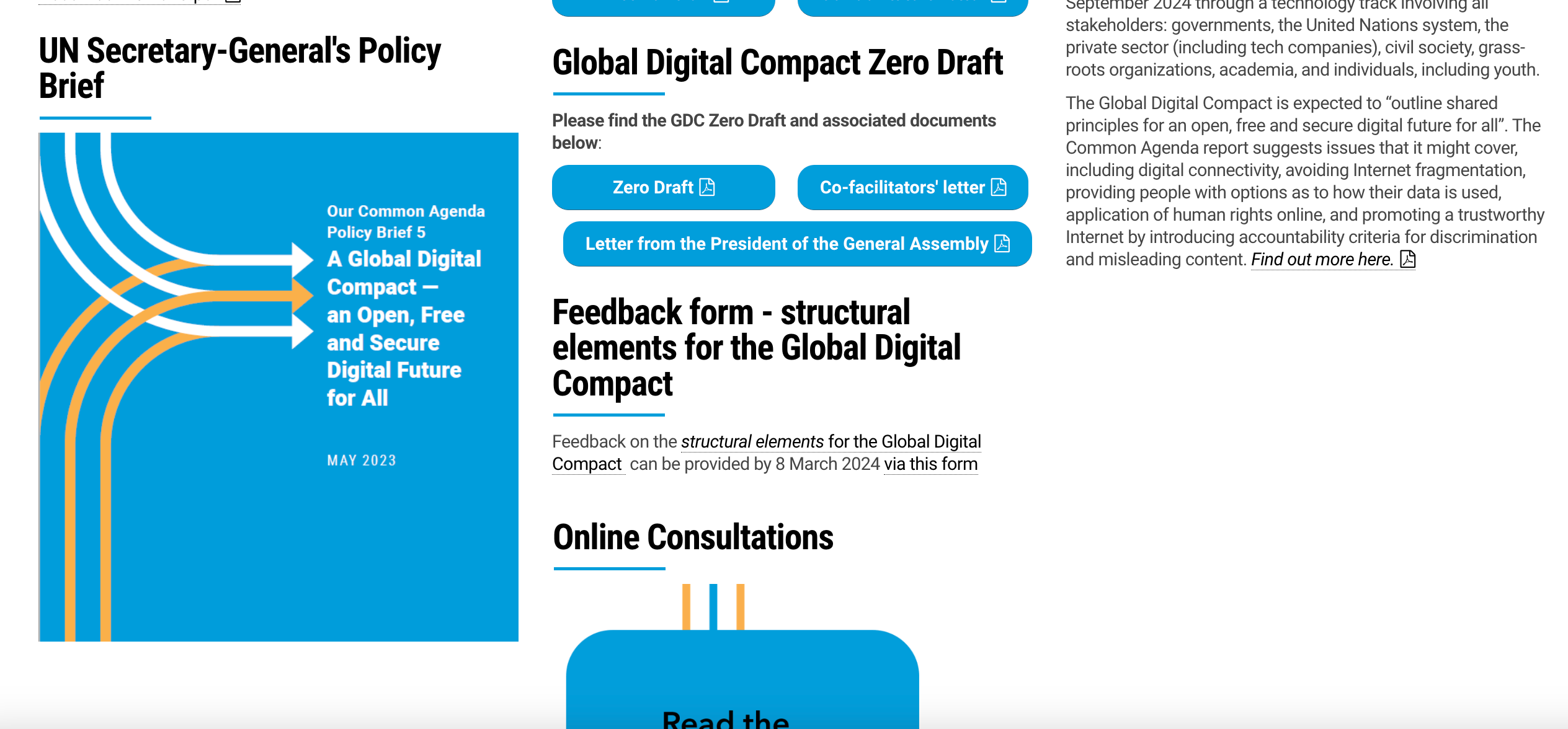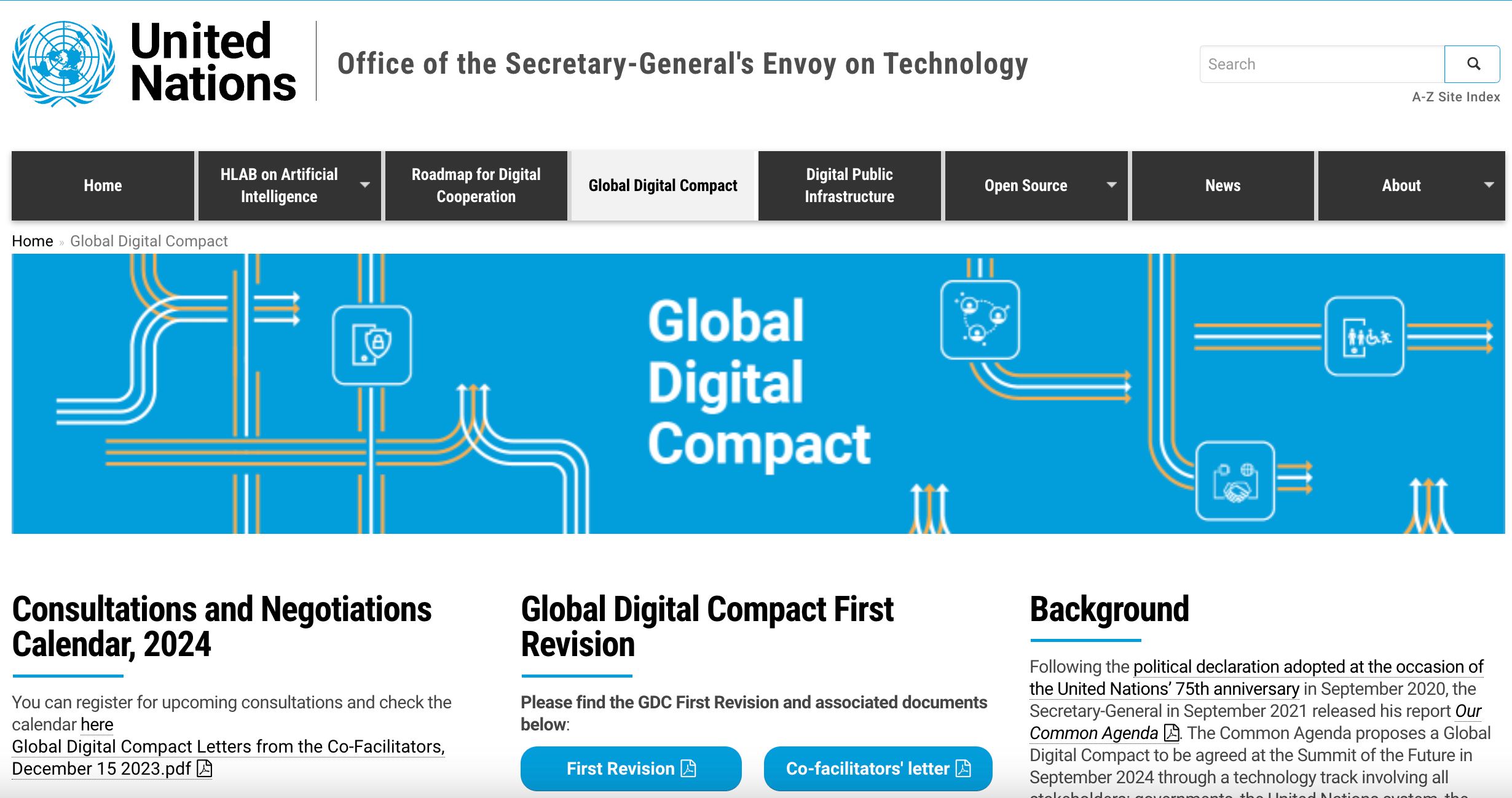 “Following the political declaration adopted at the occasion of the United Nations’ 75th anniversary in September 2020, the Secretary-General in September 2021 released his report Our Common AgendaPDF. The Common Agenda proposes a Global Digital Compact to be agreed at the Summit of the Future in September 2024 through a technology track involving all stakeholders: governments, the United Nations system, the private sector (including tech companies), civil society, grass-roots organizations, academia, and individuals, including youth.