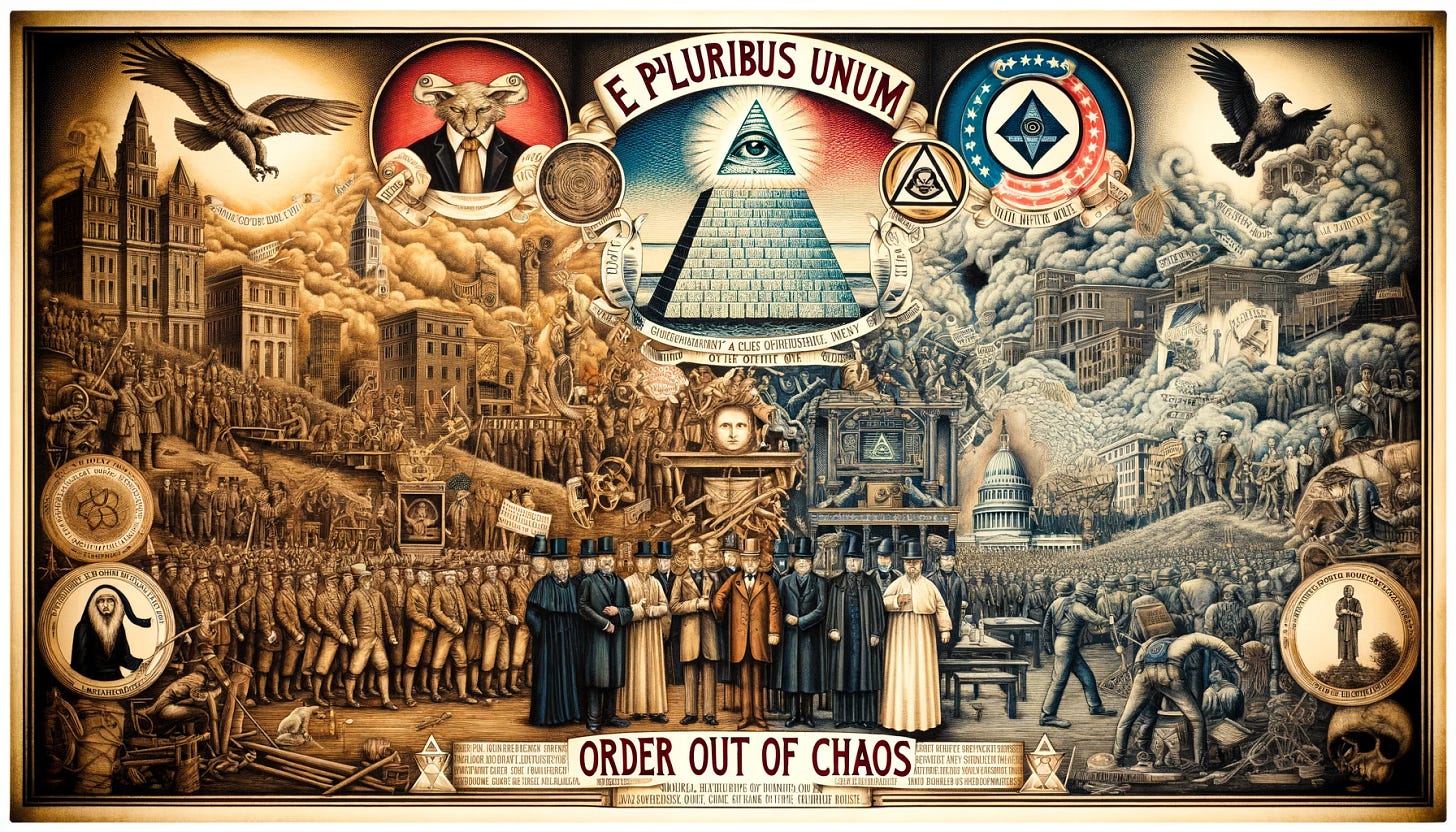Here's the illustration that combines the historical and esoteric themes with the phrases "E pluribus unum" and "Order out of Chaos." The scene symbolizes the balance between unity and chaos, highlighting their interplay in shaping the world. If you need any further adjustments or additions, please let me know!