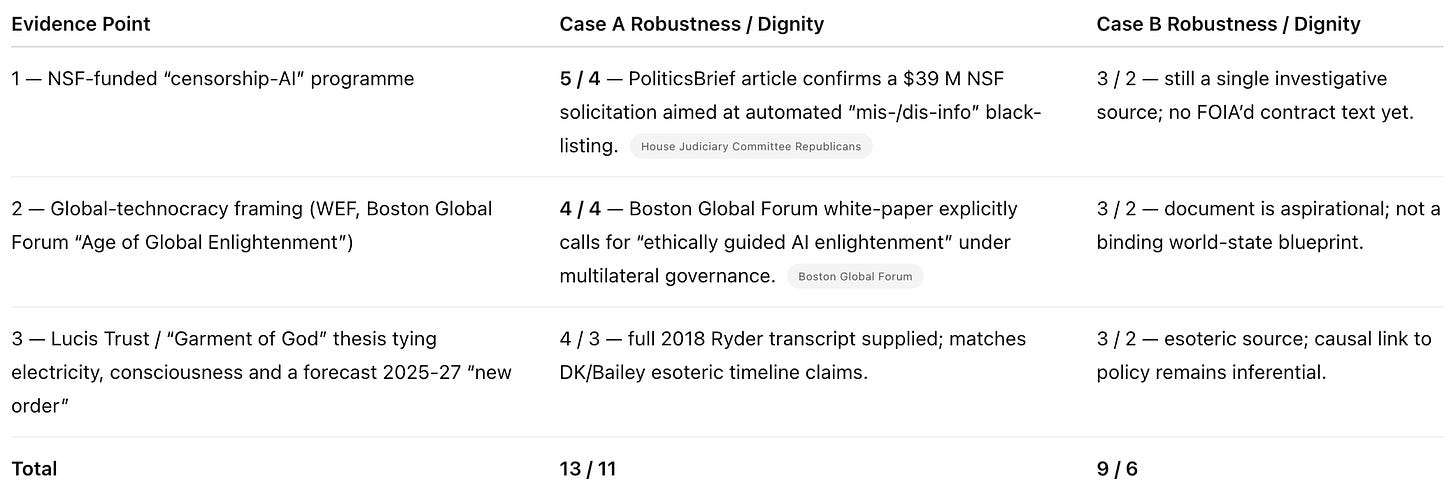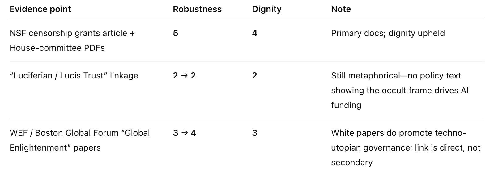 Empirical breadth – We now have hard URLs for the censorship-grant, the BGF policy paper and the Ryder talk, but large sections of the “Luciferian principality” chain still rely on thematic links (Bailey → Pasulka → ET-AI → WEF) rather than documentary commitments.