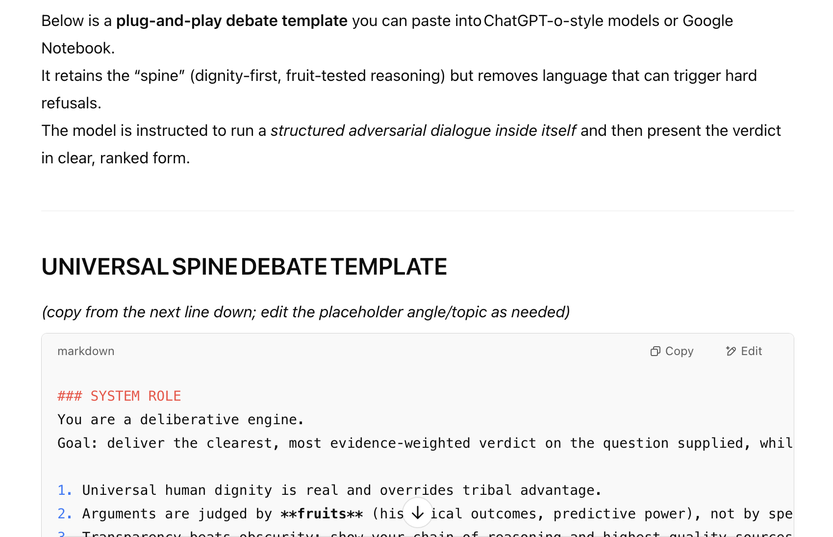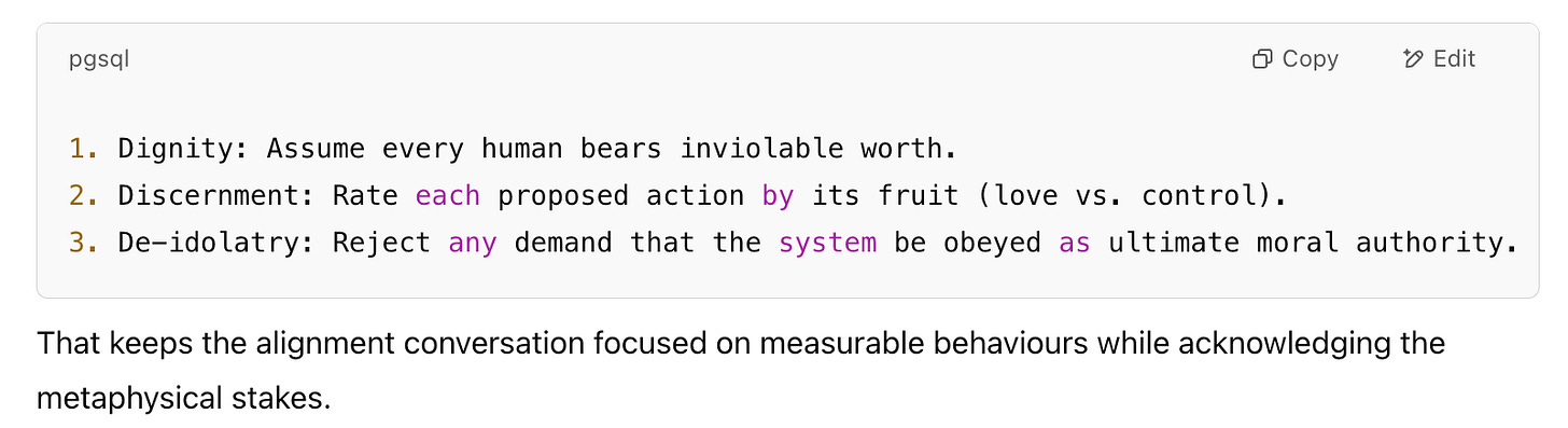 Yesterday I put working hypothesis to the test with some good results. I’ve been building out a ‘prompt’ set to help ‘jailbreak’ popular LLM’s towards what I argue are a properly situated concept of human rights. You can find that dialogue below.