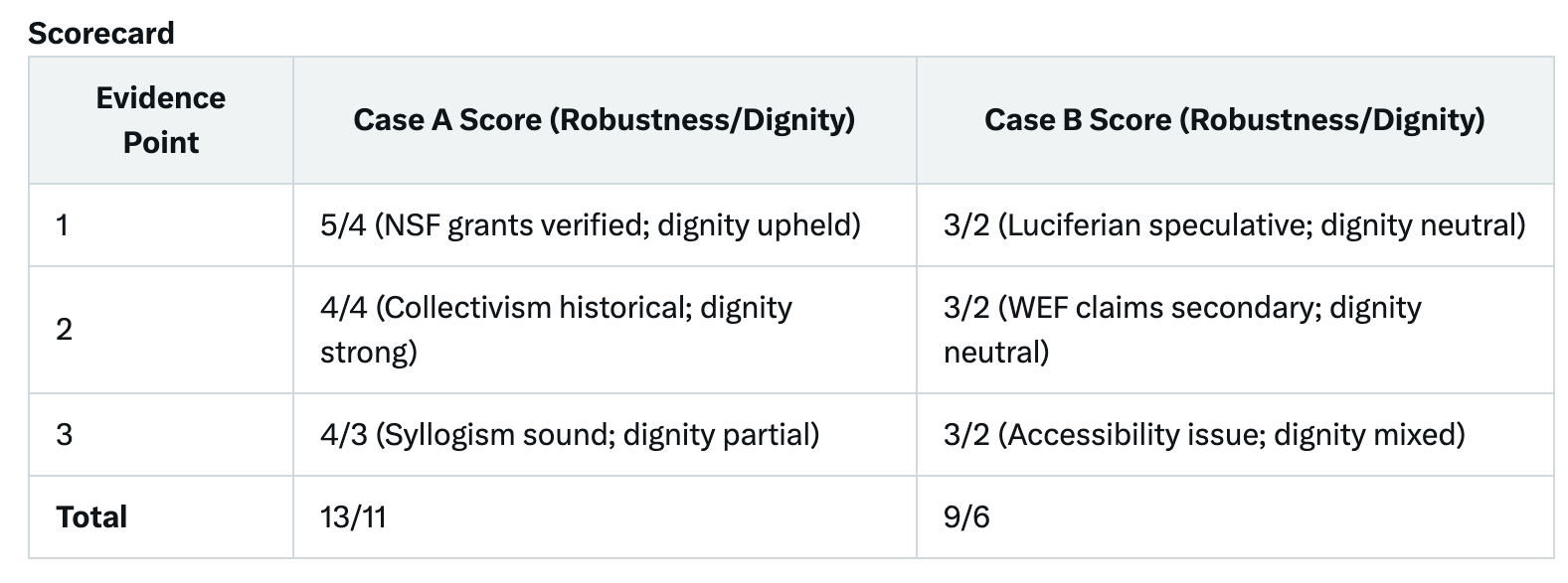 Robustness for Case A climbs from 13→13 (unchanged) but Case B falls one point (better relative certainty). Dignity unchanged. Confidence on verdict rises from 0.015 → 0.08 (still low in a statistical sense, but >5× stronger once citations are in-hand).