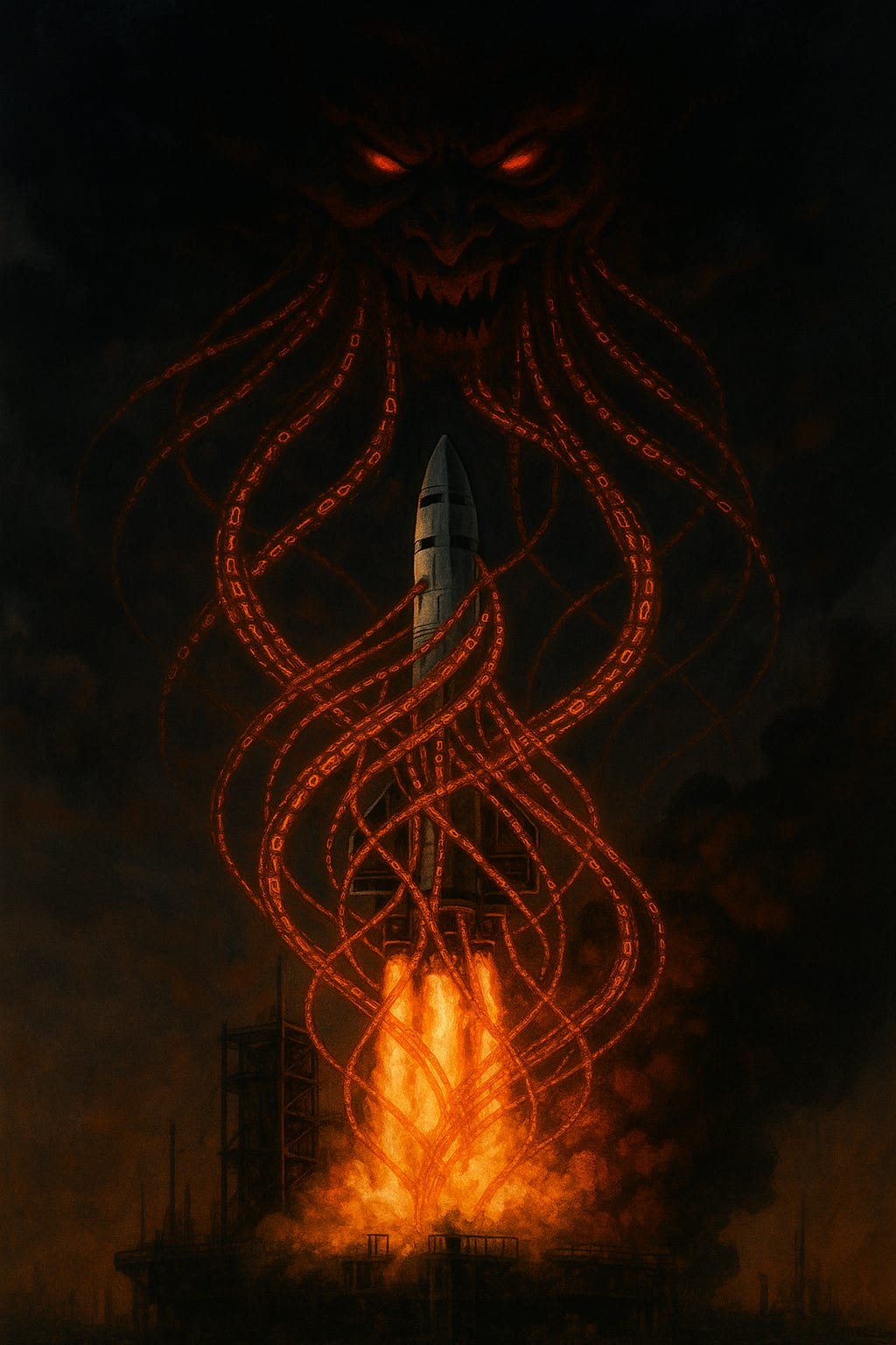 The screen glows like stained glass now. The rocket rises like a tower of Babel. The AI speaks like a priest, and we listen.