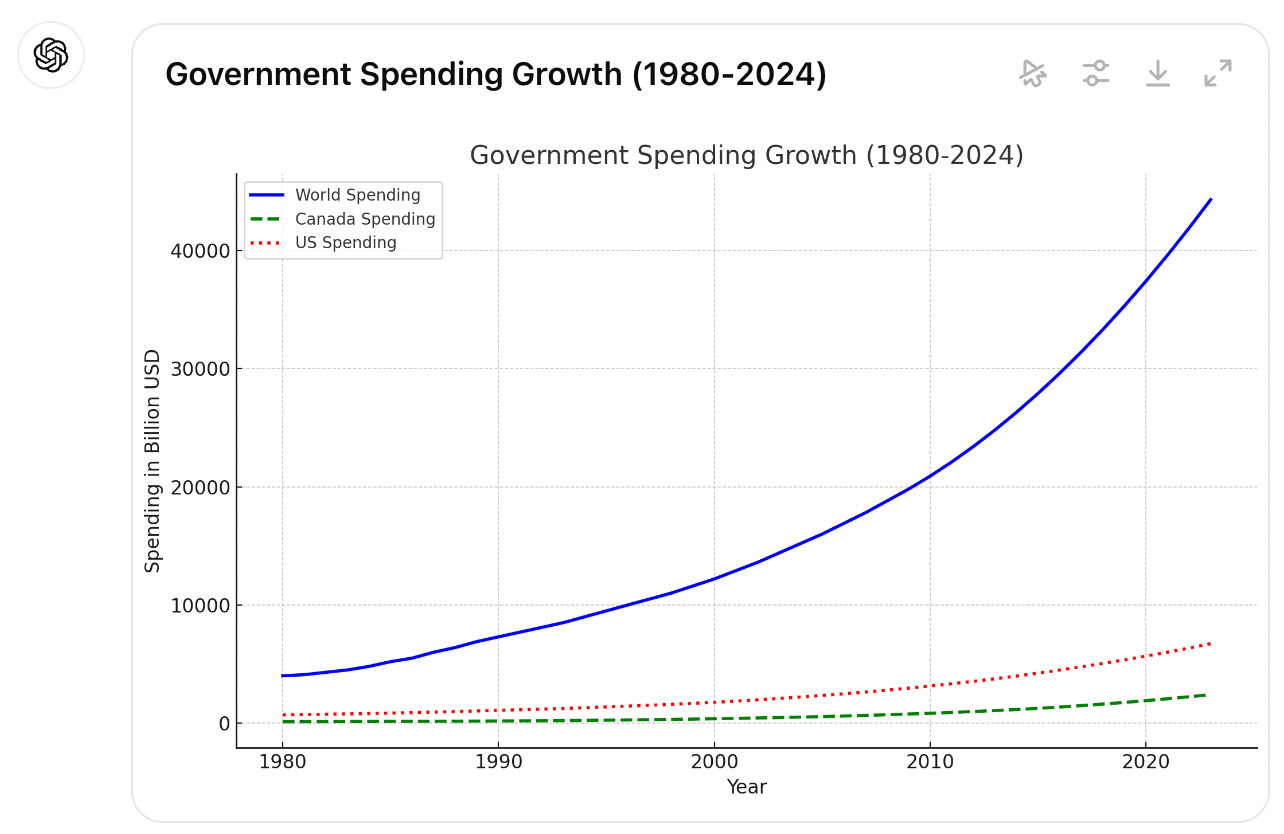 Here is the chart visualizing the government spending growth from 1980 to 2024 for the World, Canada, and the United States. The data highlights the increasing trends in government spending, with distinct styles for each region. Let me know if you would like further adjustments or additional details!