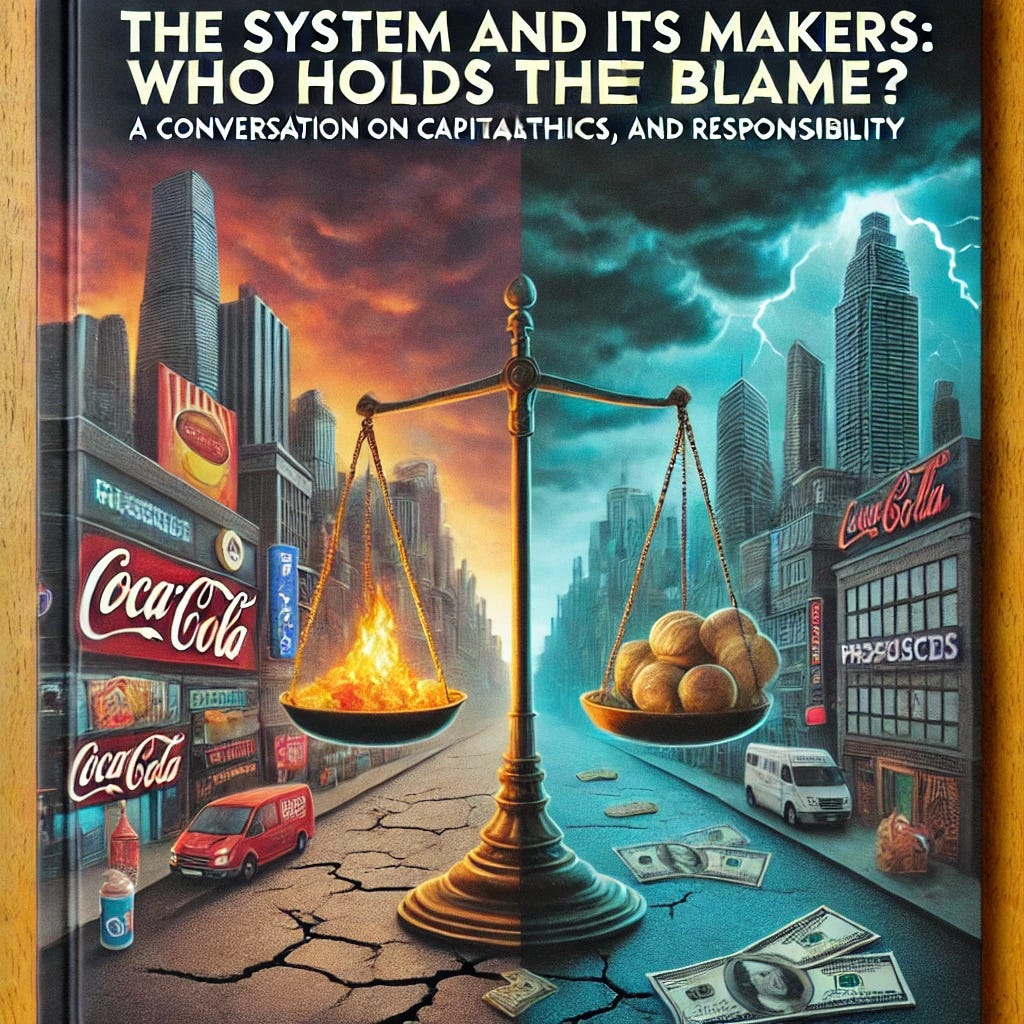 This cover page concept encapsulates the essence of your conversation, highlighting the tension between the capitalist system and the ethical considerations of the public. If this matches your vision, I can generate it for you.