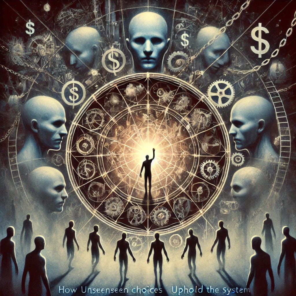 It's about the collective mindset and ethical choices of individuals who either unknowingly uphold the system or fail to recognize their power to influence it. This includes the erosion of personal ethics and the way that people become complicit in maintaining the very structures they might criticize, often without realizing it.