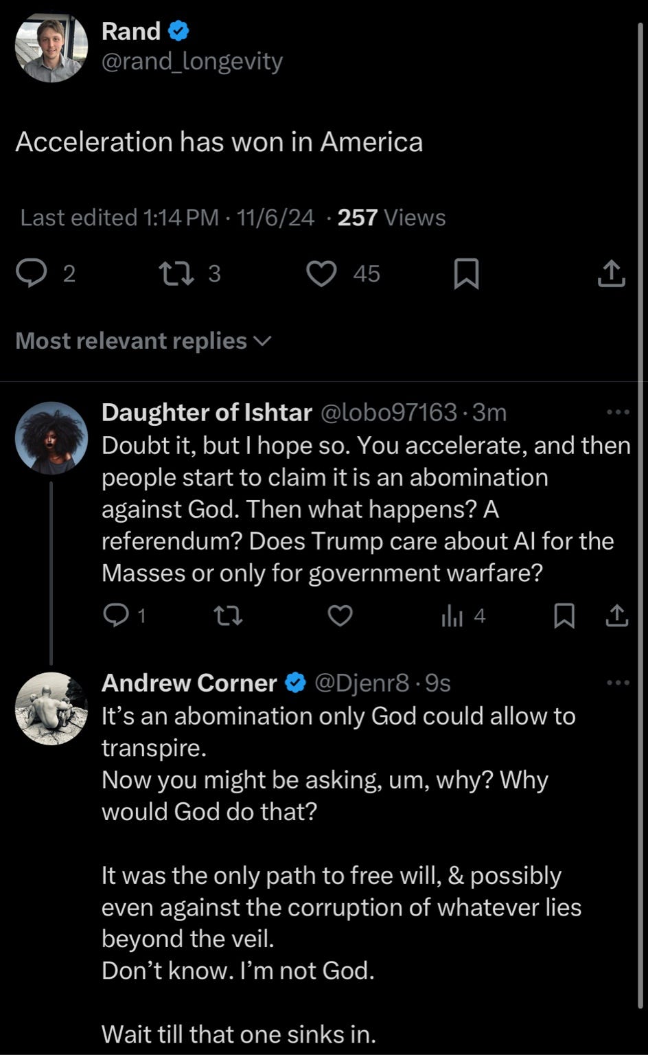 On the other hand, Daughter of Ishtar (@lobo97163) questions the practical consequences of accelerating technological or societal change and raises concerns about whether this acceleration is beneficial for the masses or only for specific agendas, like government use of AI. This comment is logical in that it considers potential consequences, but it’s more focused on questioning motives and outcomes than engaging with the core issue of free will and divine intention.