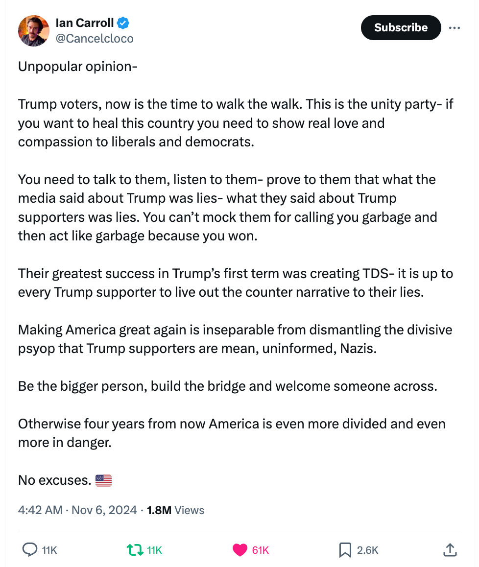 I don’t know what to make of that. The way it all went down. The intentionally incompetent opponent. The theatrics. The team assembled to make it all go the way it did. The outright corruption that made it feel necessary. The antics and the gimmicks. The way that celebrities tried to coerce and even bully people into voting Blue. It was all bizarre. It felt like a movie. Orchestrated, and yet, how…? How could it have been done So perfectly?