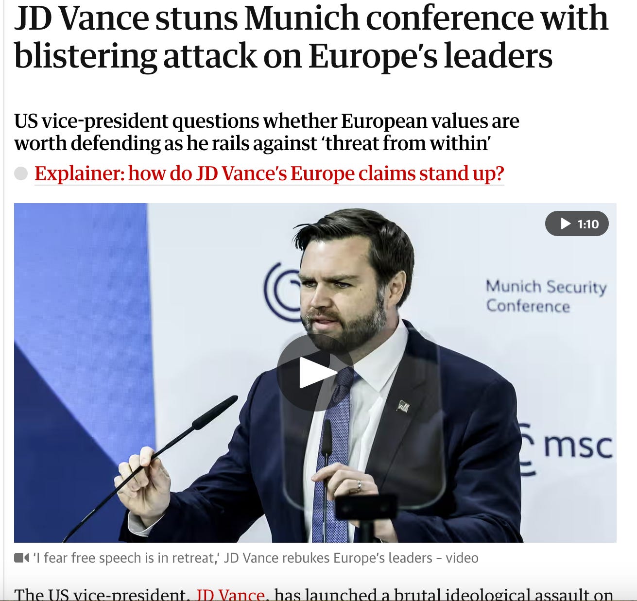 The blistering and confrontational remarks were met with shock at the conference and were later condemned by the EU and Germany, while drawing praise from Russian state television. They signalled a deepening of the transatlantic chasm beyond different perceptions of Russia to an even deeper societal rupture about values and the nature of democracy.