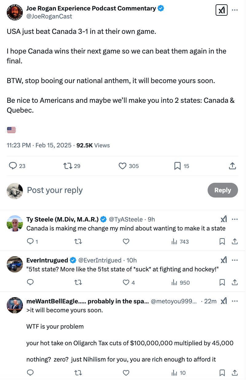You can go over to X and find people making fun of Canadians too, trying to piss men like me off. But I’m not taking the bait, but lots of people are, go look for yourself. I found this one to be particularly intentionally shitheaded.