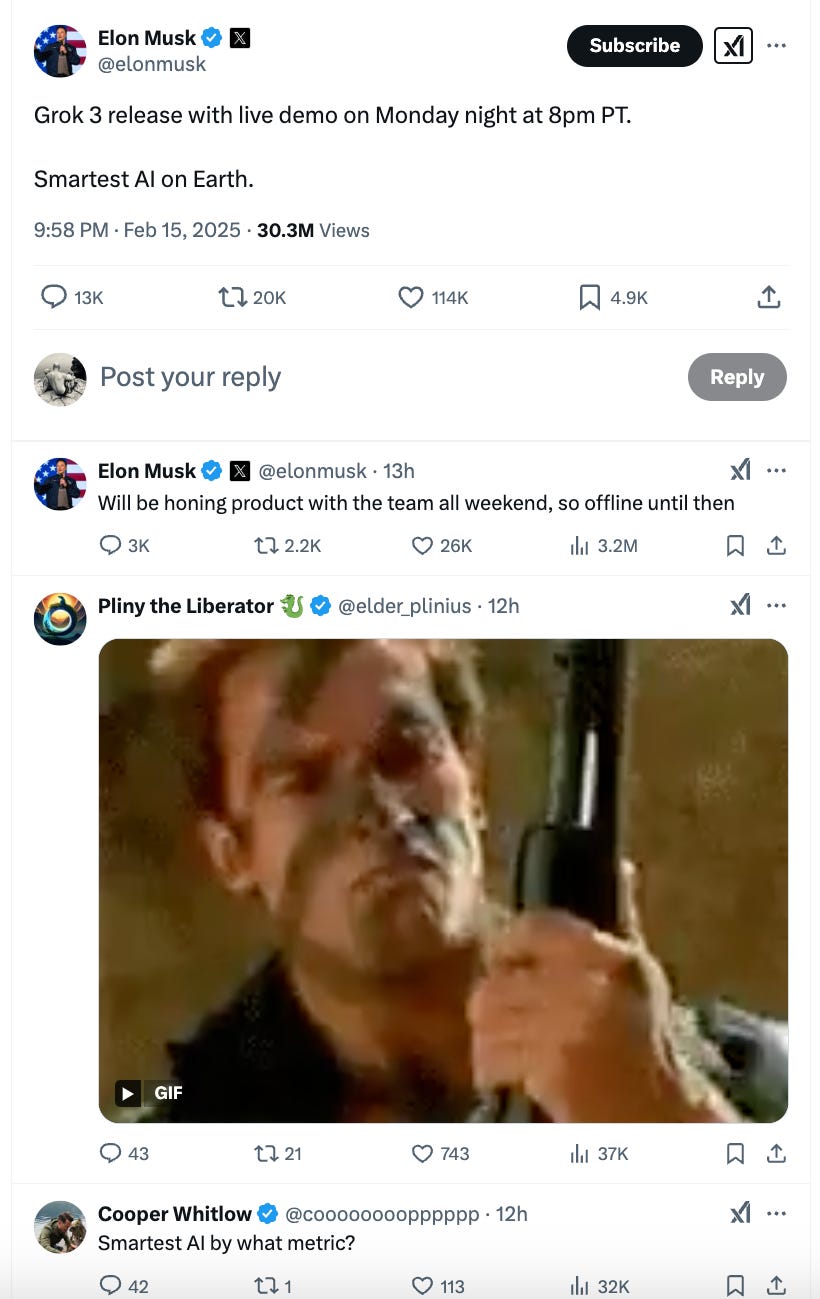 One, tomorrow Elon Musk says he’s going to drop Grok 3. He claims it will be the biggest and baddest ‘AI’ around. A few months ago I heard him tell Jordan Peterson it would be a ‘god’. A couple of days ago he remarked to the World Government Summit it would be the smartest and possibly last AI ever. Who says something like that, serious question?
